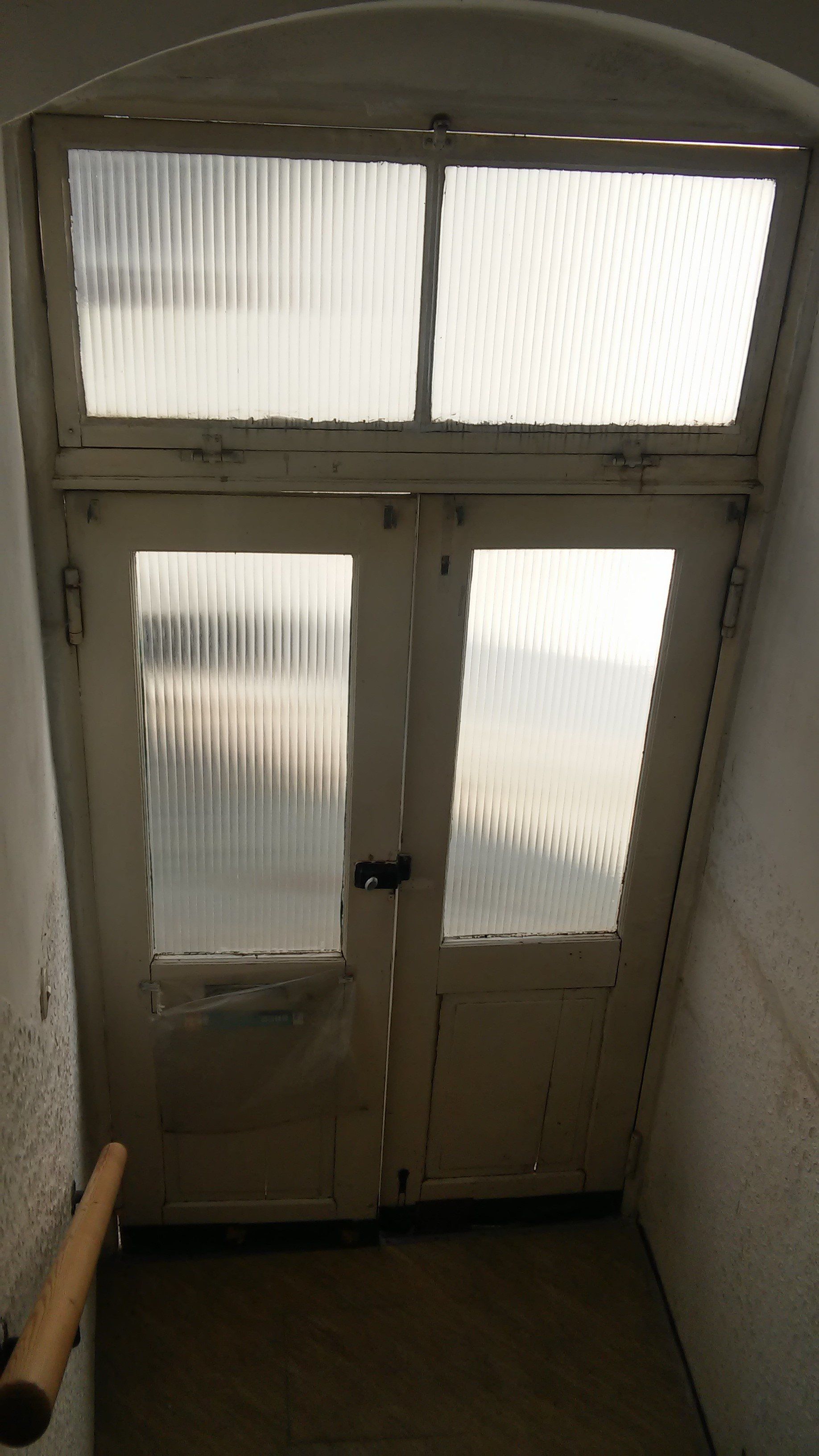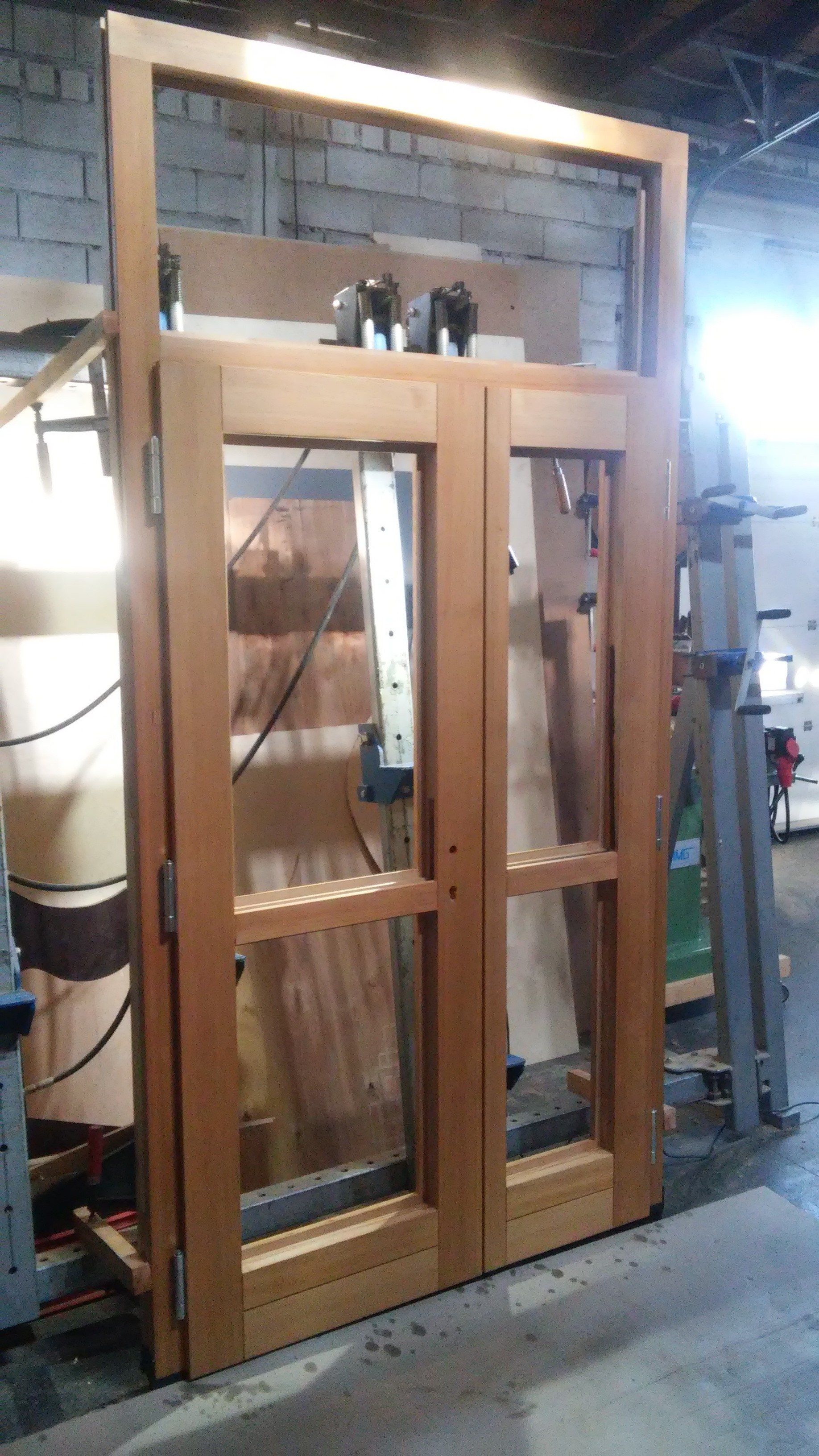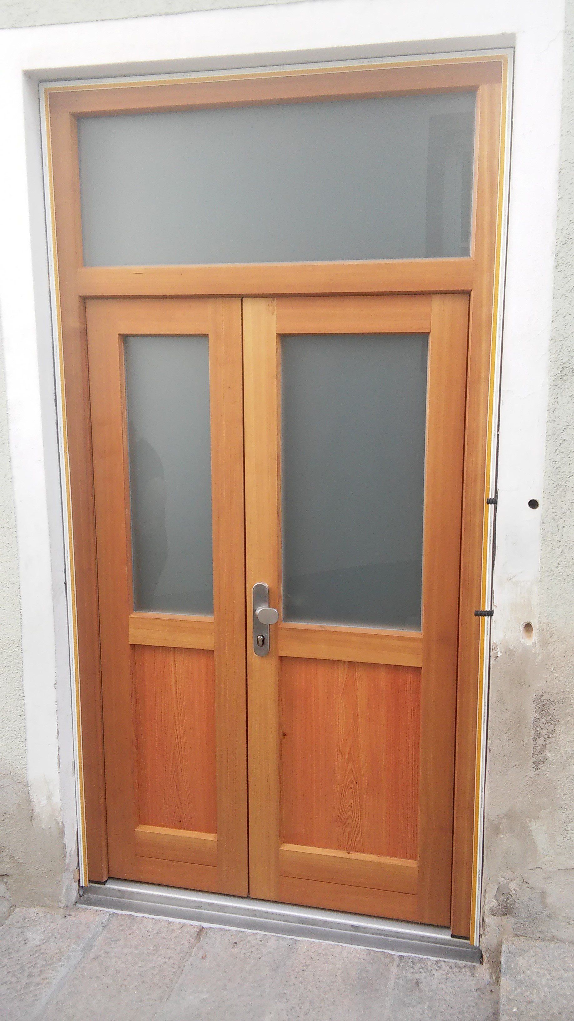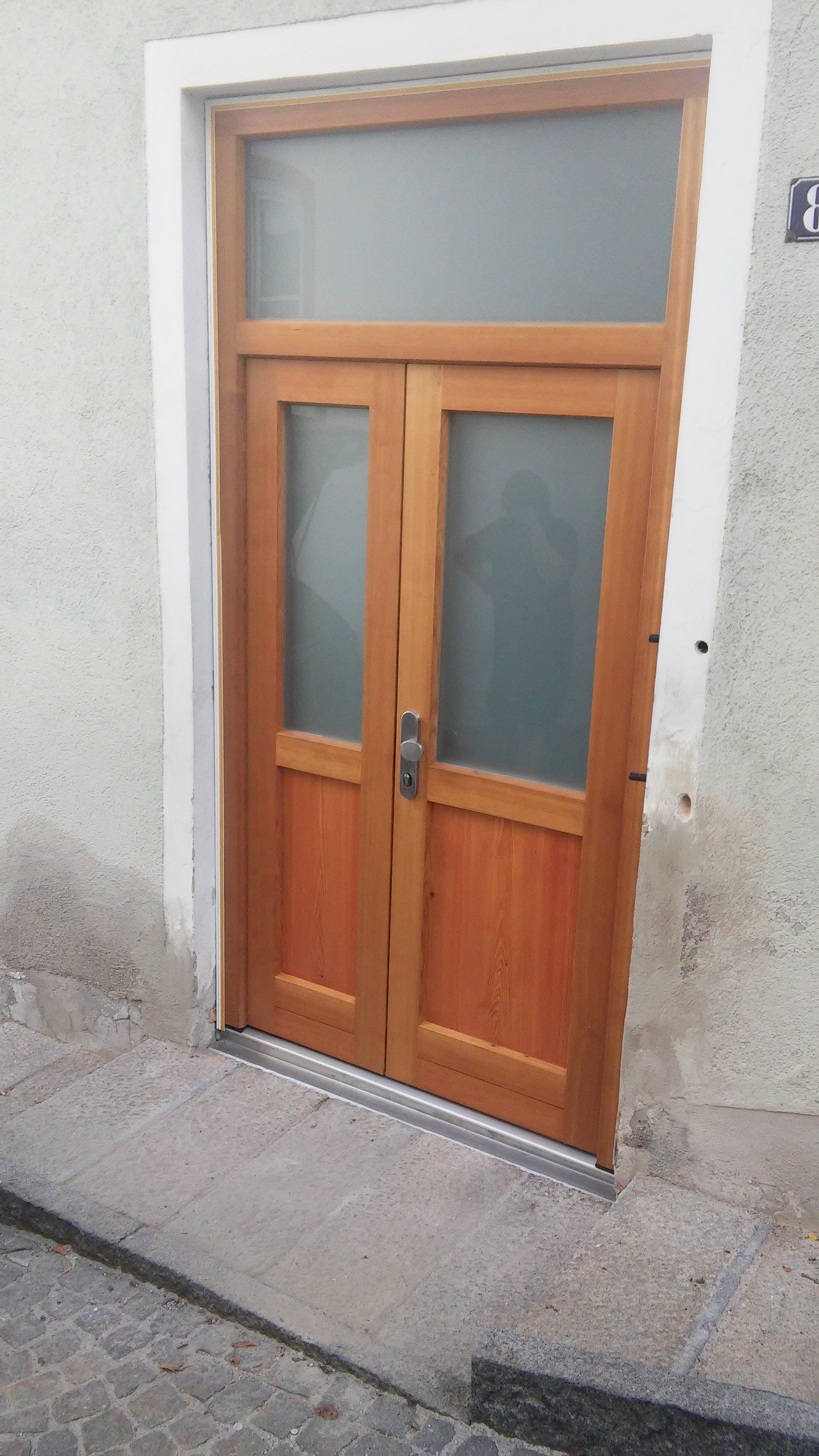 New double-leaf door made of solid larch with satin-finished insulating glass panes.